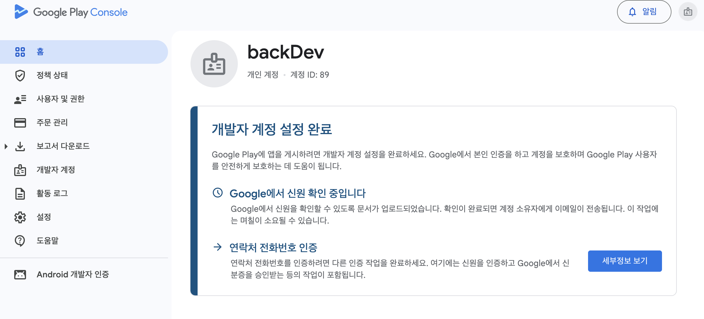 계정 인증이 완료되면 Play Console에서 다음 메뉴들을 확인할 수 있습니다.